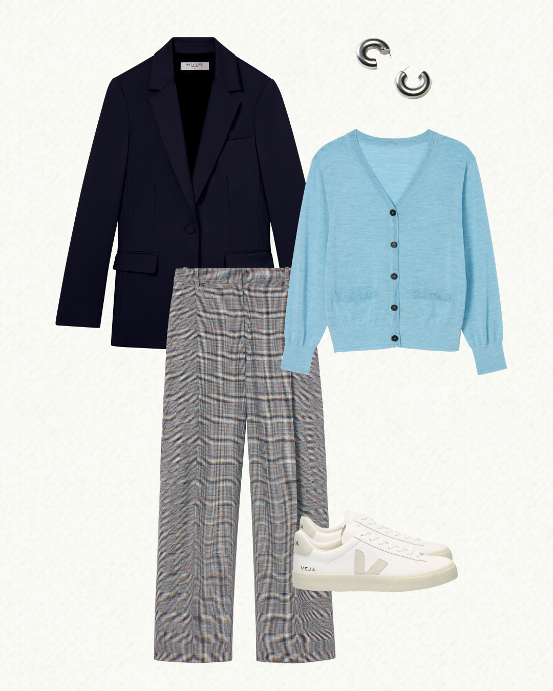 The cardigan-as-shirt trend is going absolutely nowhere in 2025 (nor should it), so introduce some refreshing brightness to your look by layering this lightweight merino-wool cardigan underneath the Yiyan blazer (unbuttoned). Slouchy pleated trousers lend a sculptural element, plus, this pair features tiny blue and orange flecks throughout the fabric that match back to the color of the cardigan. Finish the outfit with crisp white sneakers and bold silver hoops.