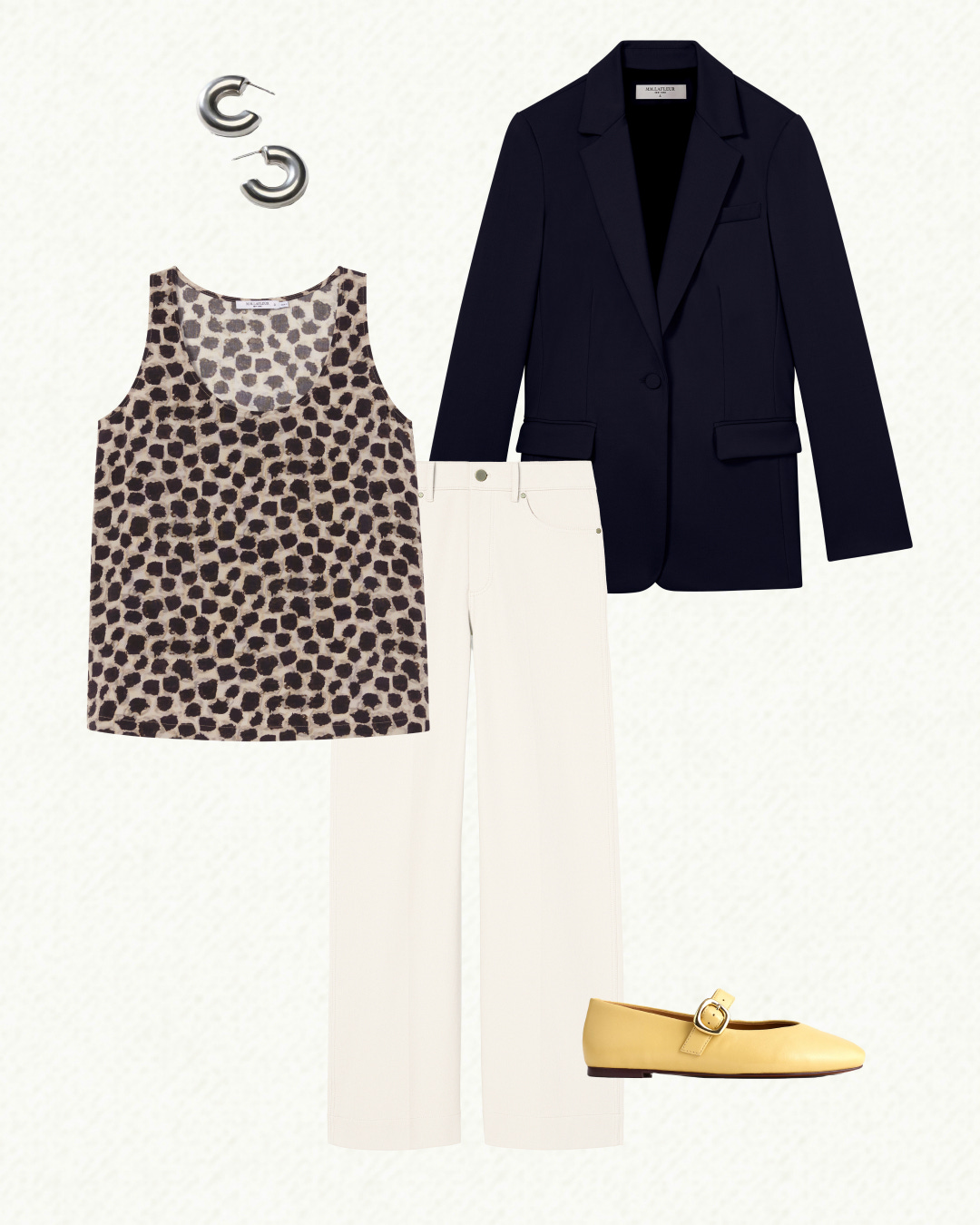 This one’s a fun twist on a classic preppy look. Instead of a seersucker blazer, go for wool twill, and trade the chinos for wide-leg white jeans (<-- this pair also happens to be stretchy). Add a breezy printed washable silk tank top to disrupt the nautical vibe, and bring in some unexpected color with these butter-yellow flats (I’m obsessed with this shade!).