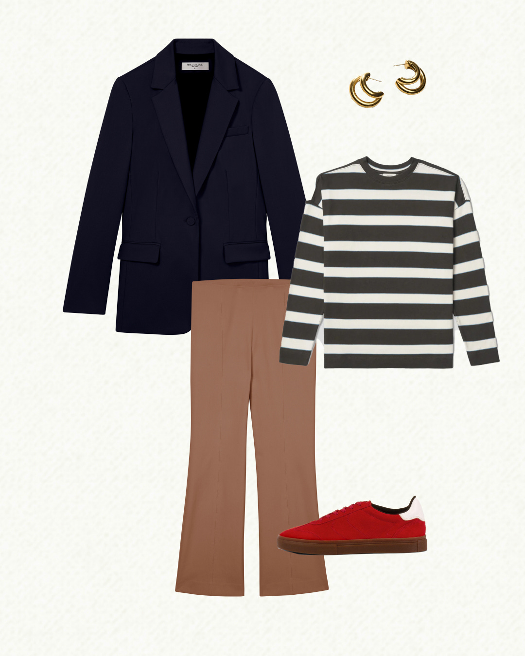 Here’s another fun play on a well-loved pairing: navy + stripes. Instead of the expected navy and white stripes, try pairing the Yiyan blazer with this long-sleeved tee, featuring bold ivory and brown stripes with subtle lines of light blue. Balance out these cool-toned shades with camel-colored kick-flare pants, cherry-red sneakers, and gold earrings.